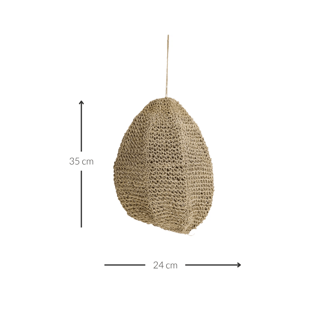 Handwoven hanging lamp in natural sisal with a distinctive organic shape — a warm and textural lighting accent.