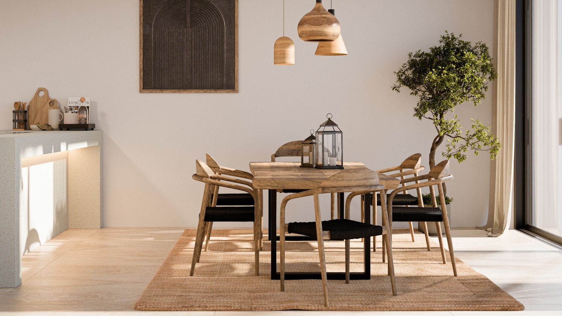 Mesa de comedor, sillas e iluminación